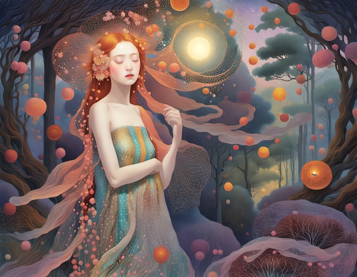 This image shows a sunset-hybrid woman in a magical forest setting. The scene is rich with color and detail, reminiscent of Klimt, rendered with smooth focus and elegant composition.