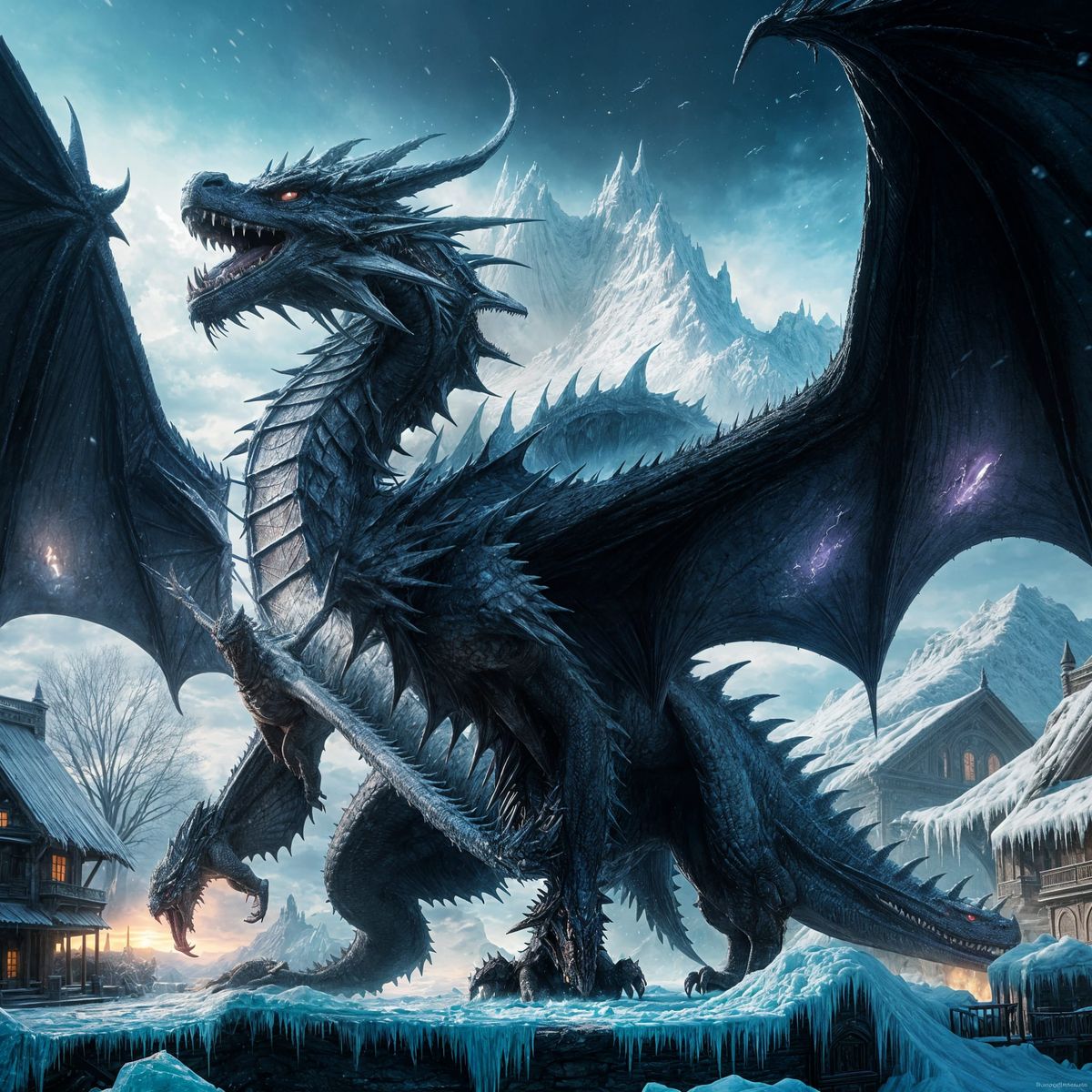 A cinematic image of a colossal ice dragon attacking a village with its icy breath. The scene features dynamic lighting, a dark fantasy aesthetic, and a colour palette of purple and yellow.