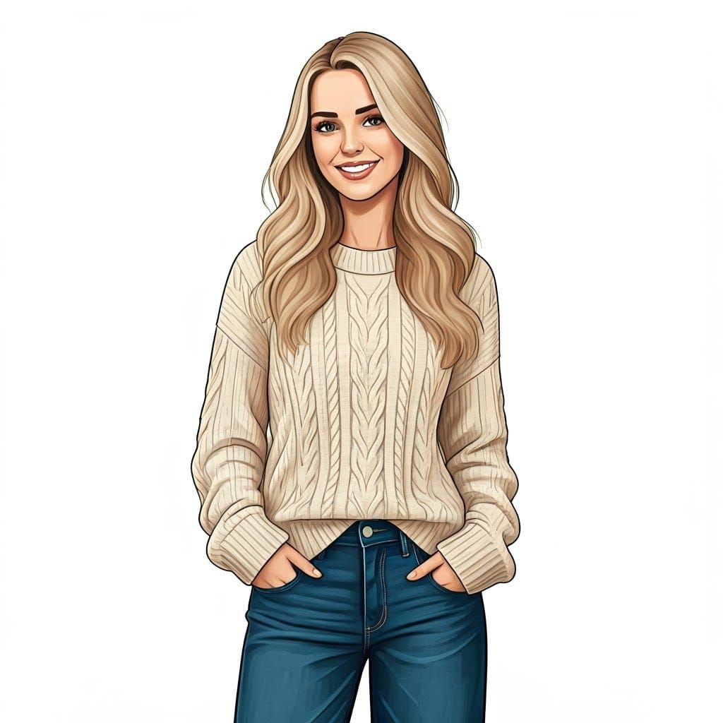 A beautiful young woman smiles warmly, her blonde hair and brown eyes radiating joy. The portrait captures a cozy elegance in soft, ethereal light, reminiscent of art nouveau paintings.