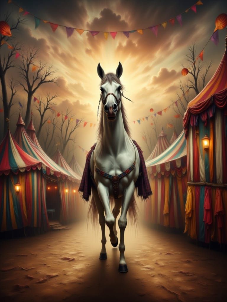 A majestic white horse, dressed for the circus, walks down a dusty path. Colorful tents and streamers set an autumn evening scene with warm lights, evoking a vintage carnival atmosphere.