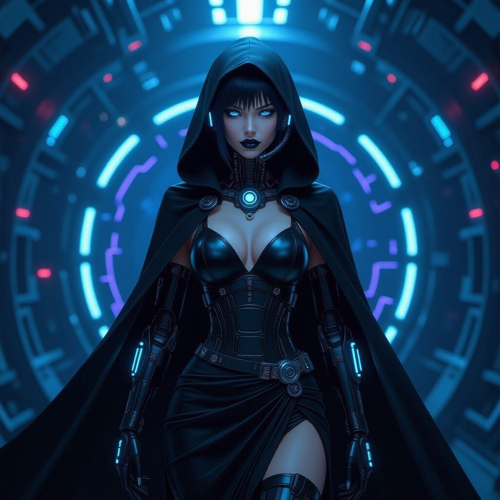A semi-realistic anime style portrait of a biomechanical woman with electric blue eyes and cyan accents in a futuristic starship. Features H.R. Giger inspired details.