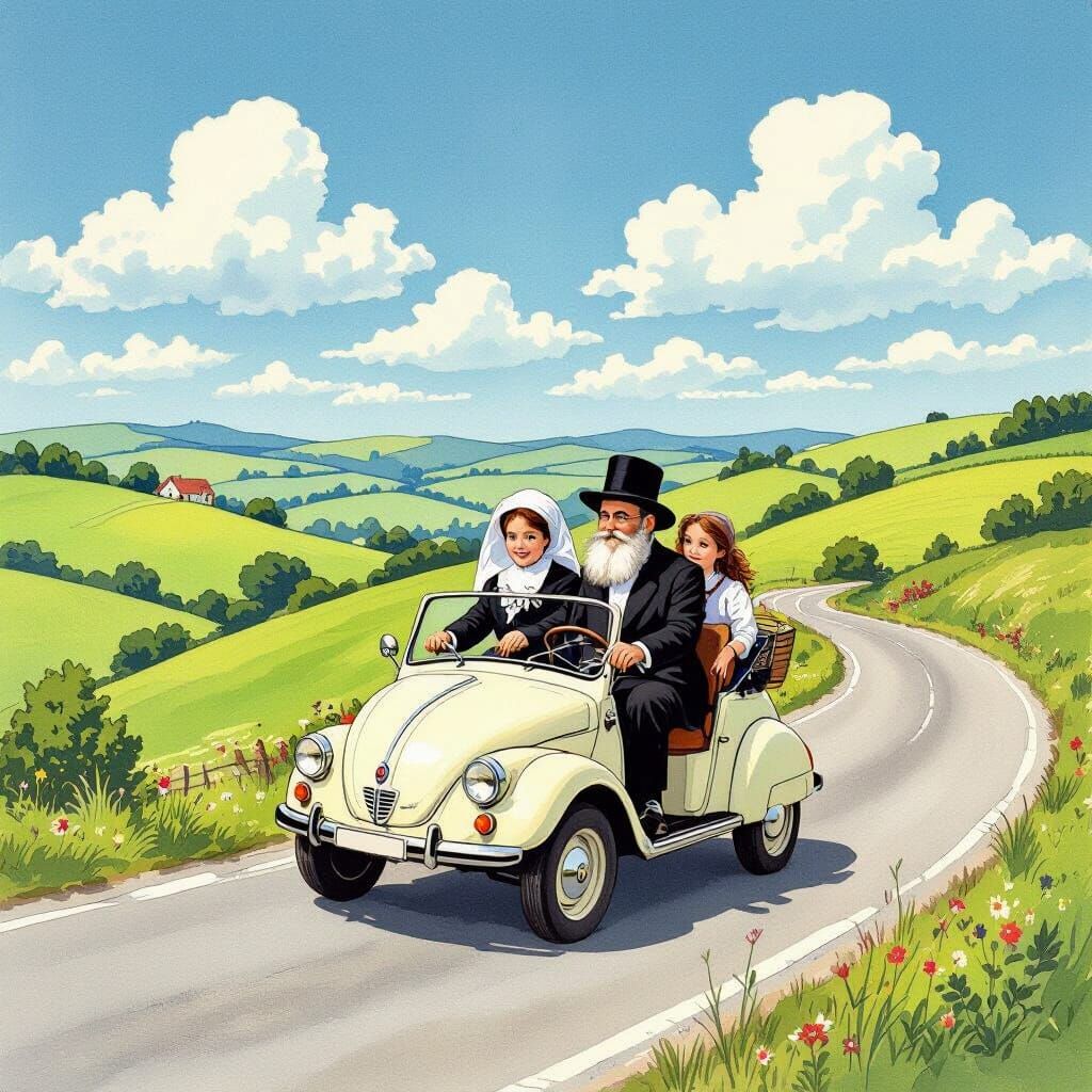 This image shows an Orthodox Jewish family in a vintage car driving on a winding road. The artwork features intricate ink lines and delicate watercolor textures in a whimsical, idyllic atmosphere.