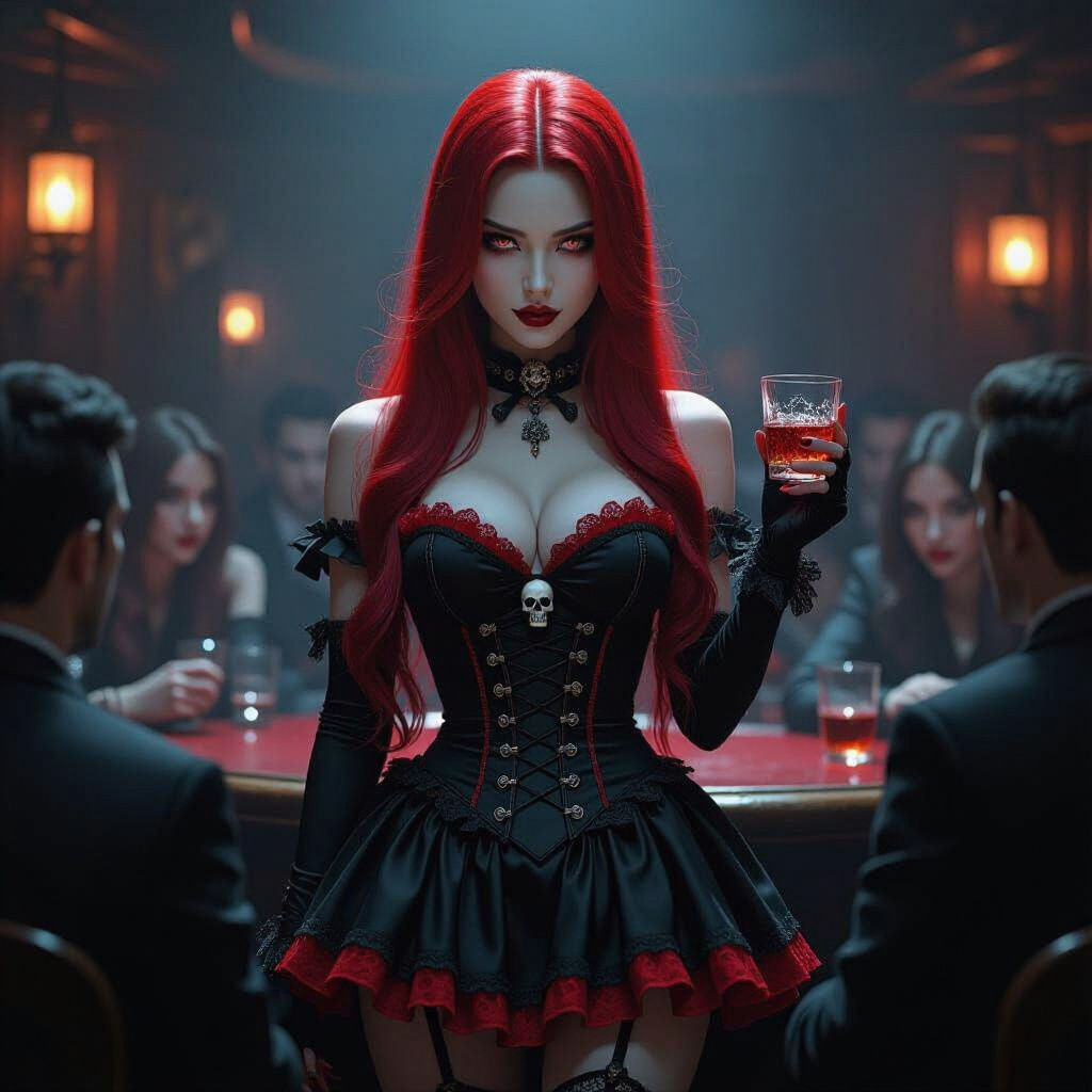 This image features an exceptionally beautiful Japanese vampire with striking red hair in a gothic mini dress. Set in a dimly lit vintage bar, the mood is dark and captivating.