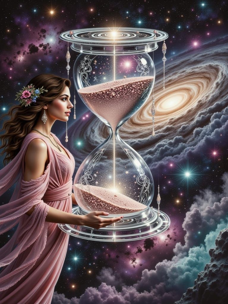 A hyperrealistic image of a goddess in a pink dress holding a cosmic hourglass in a nebula. Features painterly details and sharp focus on stardust and galaxies.