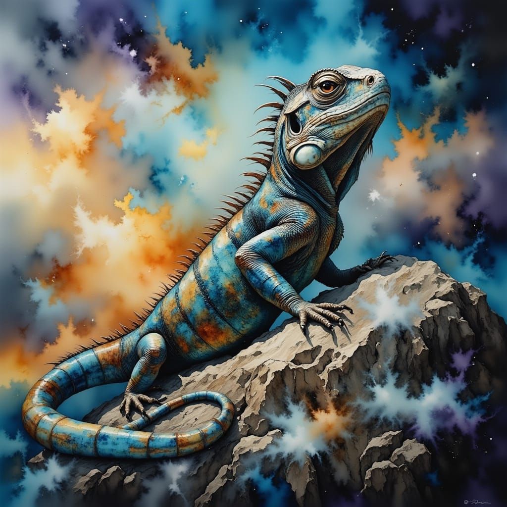 A striking picture of a lizard resting on a textured rock, rendered with luminous colors and layered clouds in a water ink color style.
