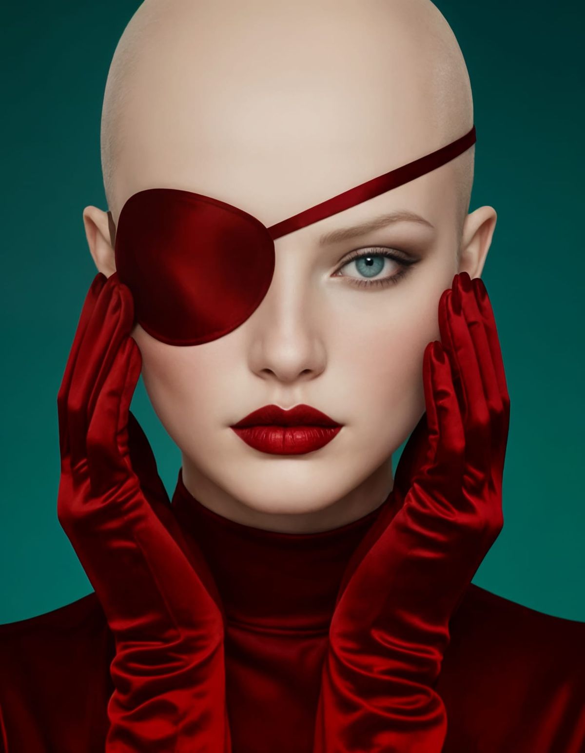 A striking picture of a beautiful bald woman with an eyepatch. She's wearing red gloves and a flowing dress, bathed in soft teal backlight creating a divine, ethereal atmosphere.