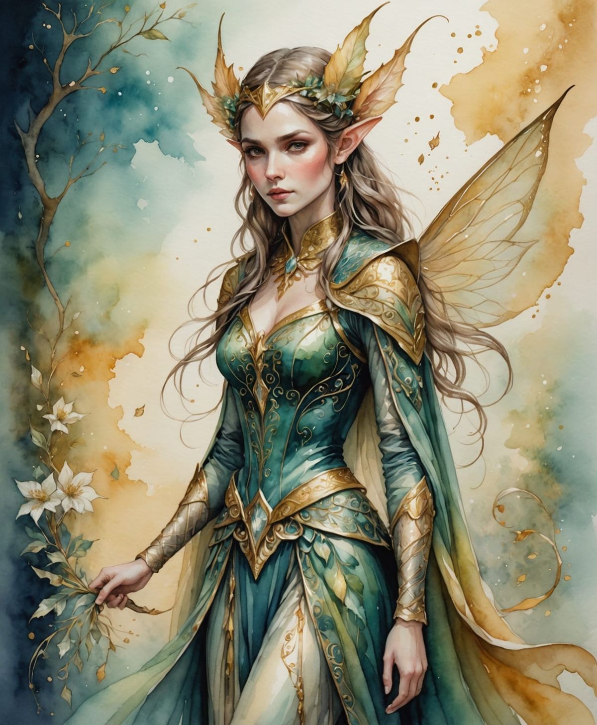 This image shows an elf in a shimmering outfit with soft luminous gradients. The fantasy art is set against a textured paper background, creating an ethereal and elegant scene.
