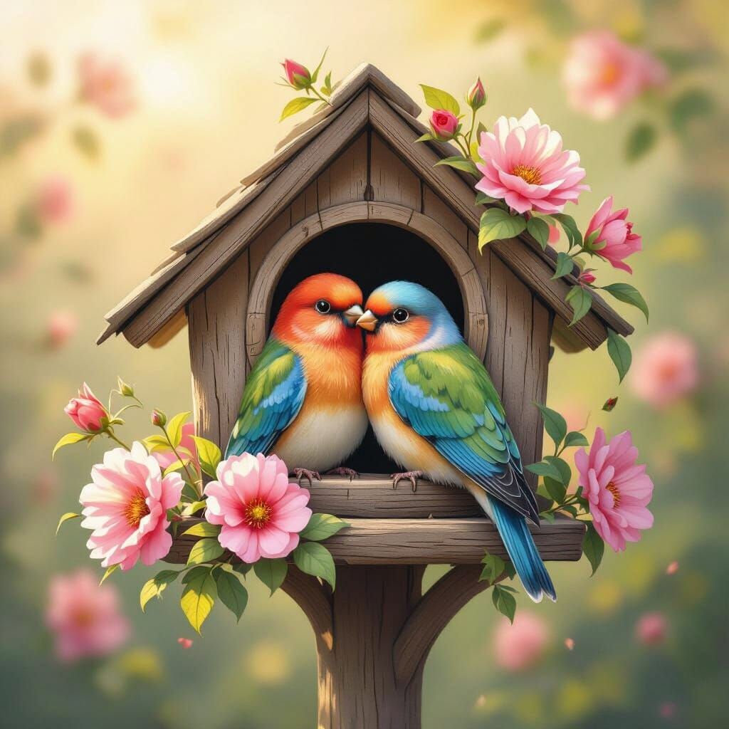 This image shows a charming birdhouse with a pair of lovebirds snuggling amidst vibrant flowers and soft sunlight. The scene is depicted with ultra-realistic, fantasy details in a dreamy, romantic atmosphere, reminiscent of watercolor art.