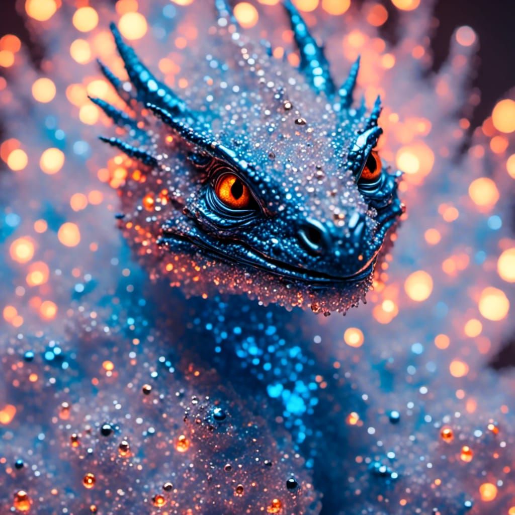 A captivating image of a luminous blue dragon hatchling, up close. The artwork uses a crystalline, frosted style with lava-like light effects.
