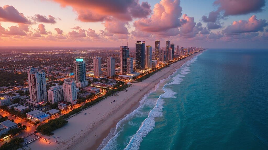 This image captures the vibrant essence of Vice City, a metropolis where 80s excess meets sun-kissed paradise. A kaleidoscope of Art Deco and modern architecture contrasts with the pulsing nightlife, while luxury and danger entwine beneath the city's neon glow.