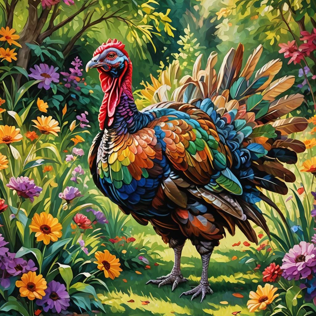 This image shows a vibrant oil painting of a colorful turkey in a garden. The warm color palette and impasto brushstrokes create a vivid and detailed portrait of the bird amid lush foliage.