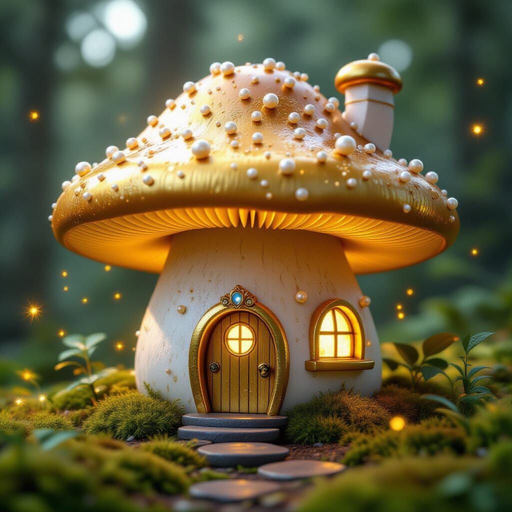 This image showcases a stunning, ultra-realistic mushroom house crafted from pure gold, adorned with pearls and gemstones. It features a glowing cap and elegant details, presented in a cinematic 3D style.