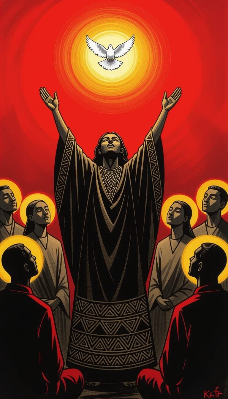 This striking image depicts a spiritual gathering in a folk art style. A central figure with arms raised is surrounded by others, with a dove flying above against a vibrant red gradient background.