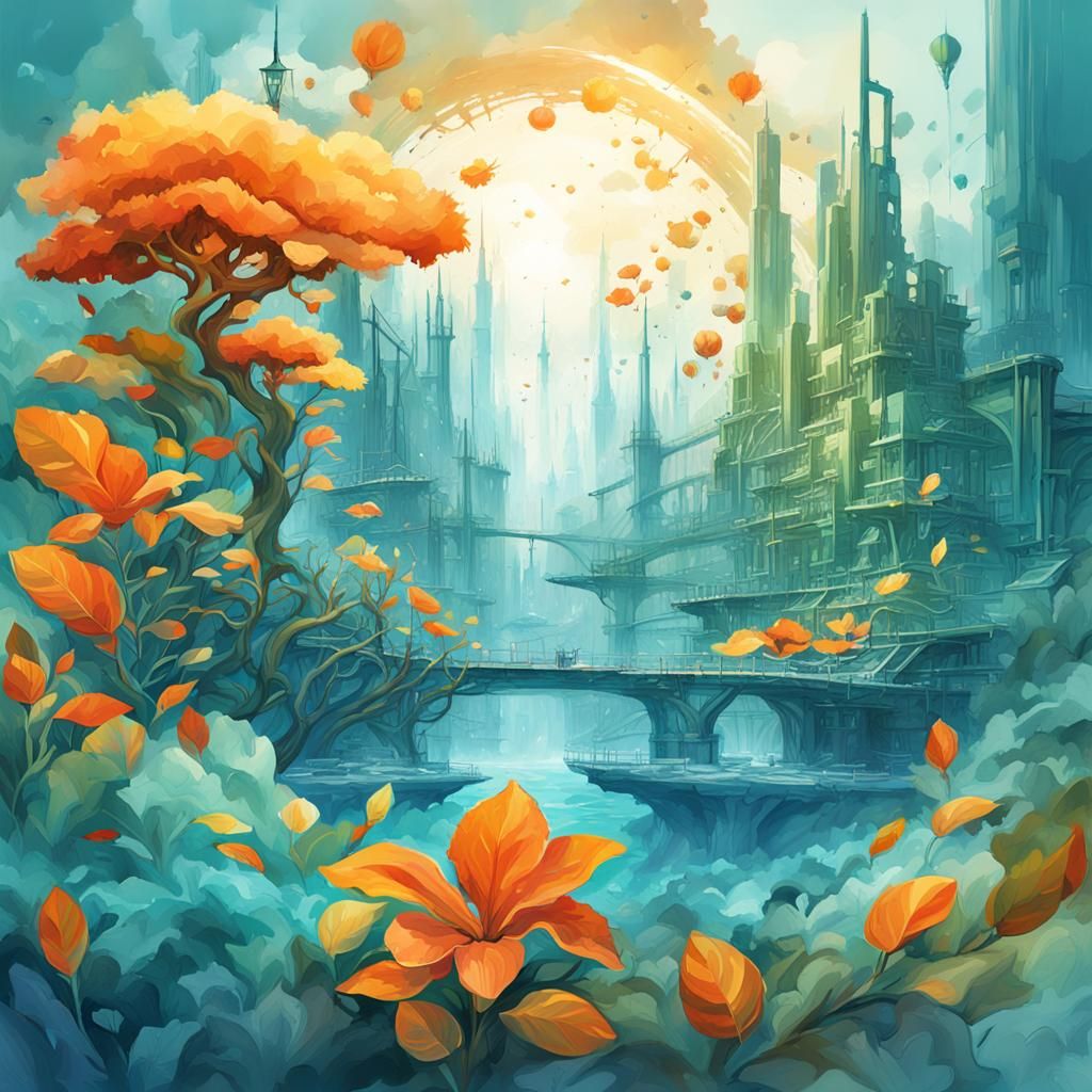 A digital watercolor illustration of sustainable development. The image showcases eco-responsibility with intricate details, dynamic lighting, and volumetric effects in blue-celadon tones.
