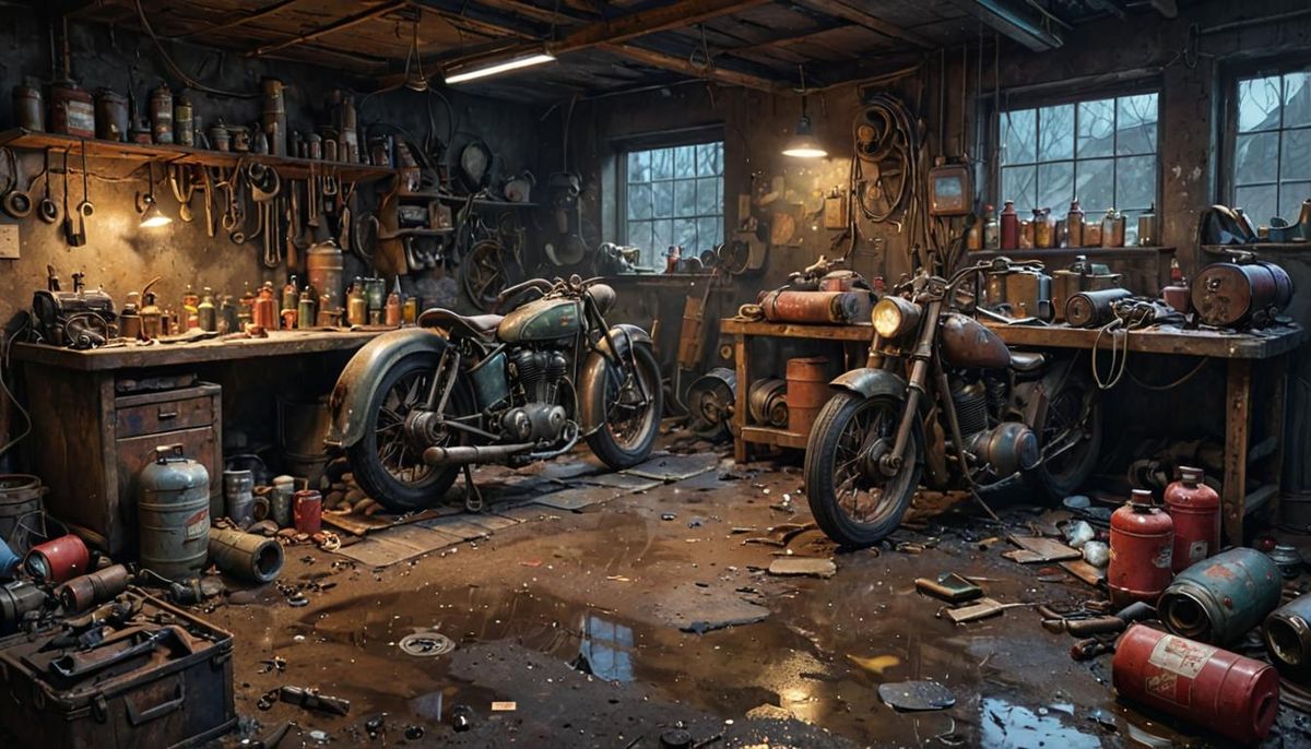 This image shows a grim, ruined workshop interior from the 1940s, filled with industrial debris. A motorcycle with a fuel canister trailer sits amid the chaos, illuminated by soft, cinematic light in an expressionist oil painting style.