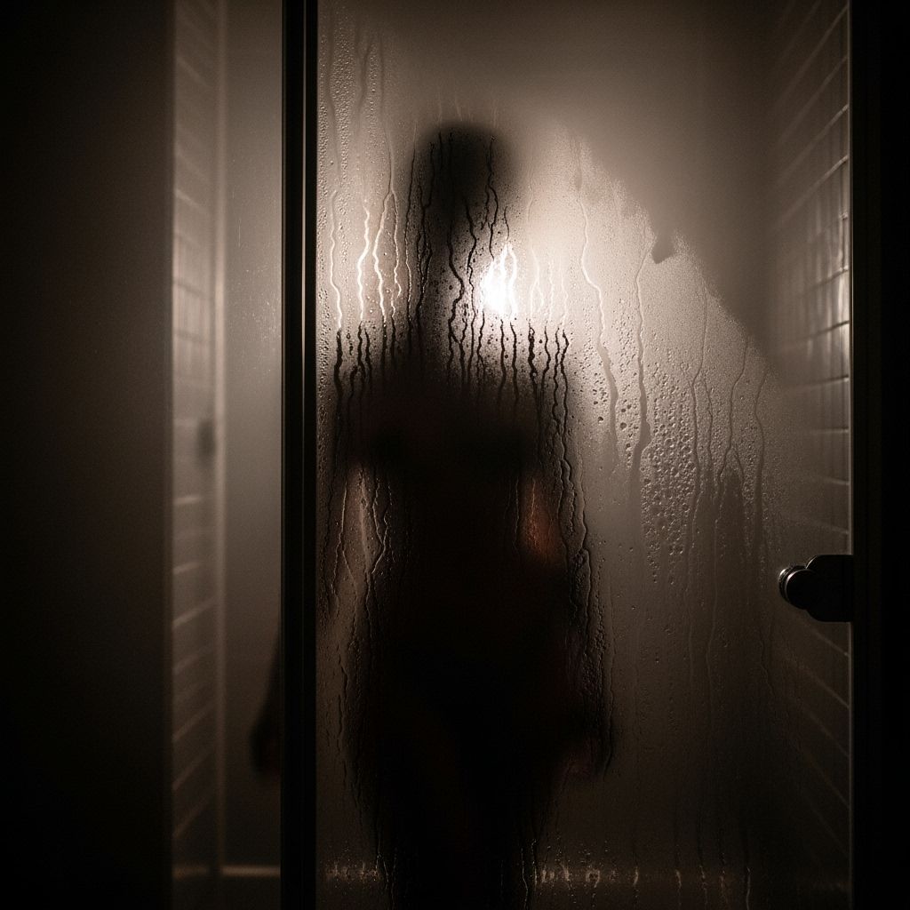 A blurred figure stands in a steamy, dimly lit room, partially hidden by condensation. The image focuses on light and shadow to create a sensual, mysterious atmosphere.