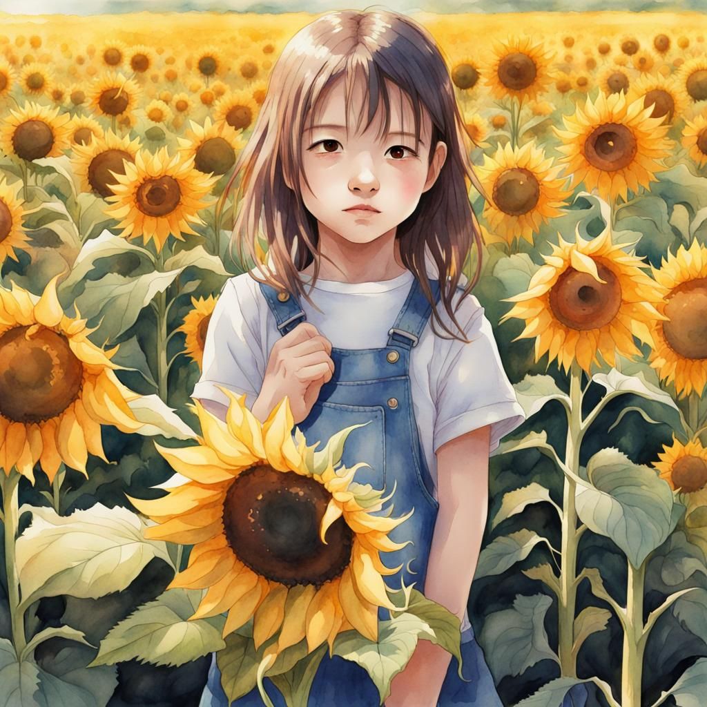 This image shows a girl in a field of sunflowers. The artwork is reminiscent of Japanese manga, with a colorful background, side lighting, and intricate details.