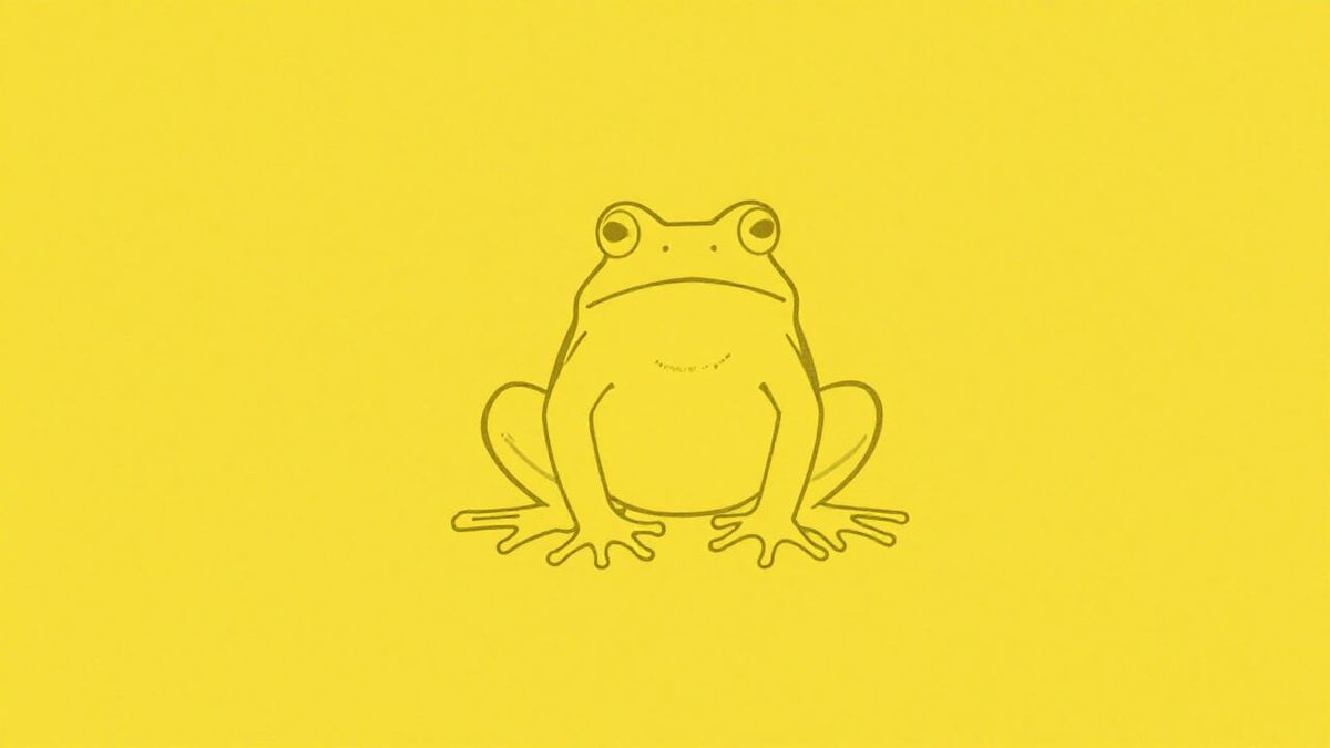 A striking image featuring a central, clean line drawing of a frog on a yellow background. The composition is minimalist with significant negative space, inspired by geometric art.