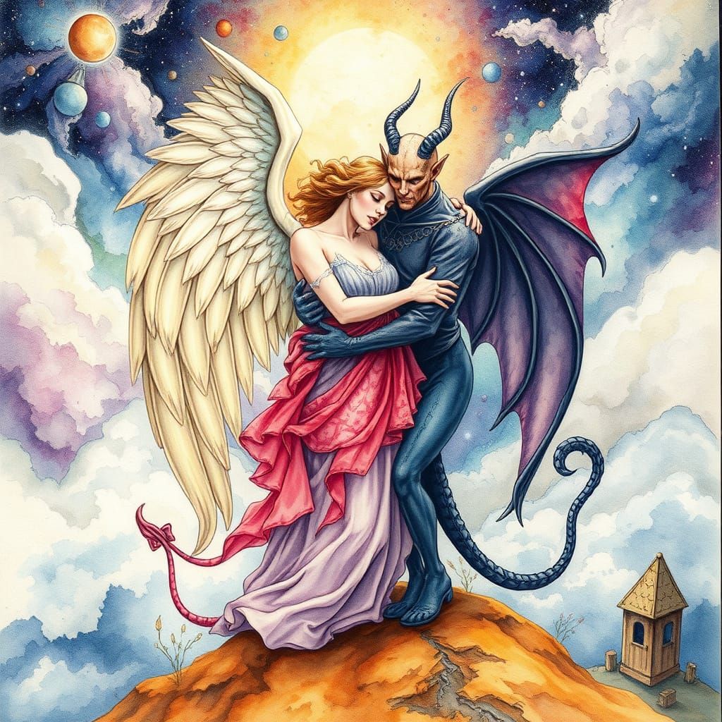 This image depicts an angel and demon embracing in a surreal, cosmic setting. The artwork features whimsical watercolor techniques with visible brush details for a painterly, dreamlike quality.