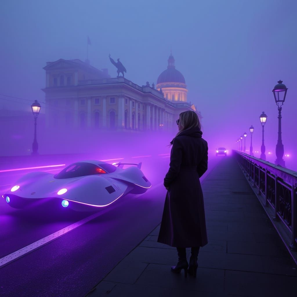 This image shows a woman on the Palace Bridge in Saint-Petersburg amidst purple fog and flying cars. The scene has a futuristic aesthetic with neon lights and metallic textures.