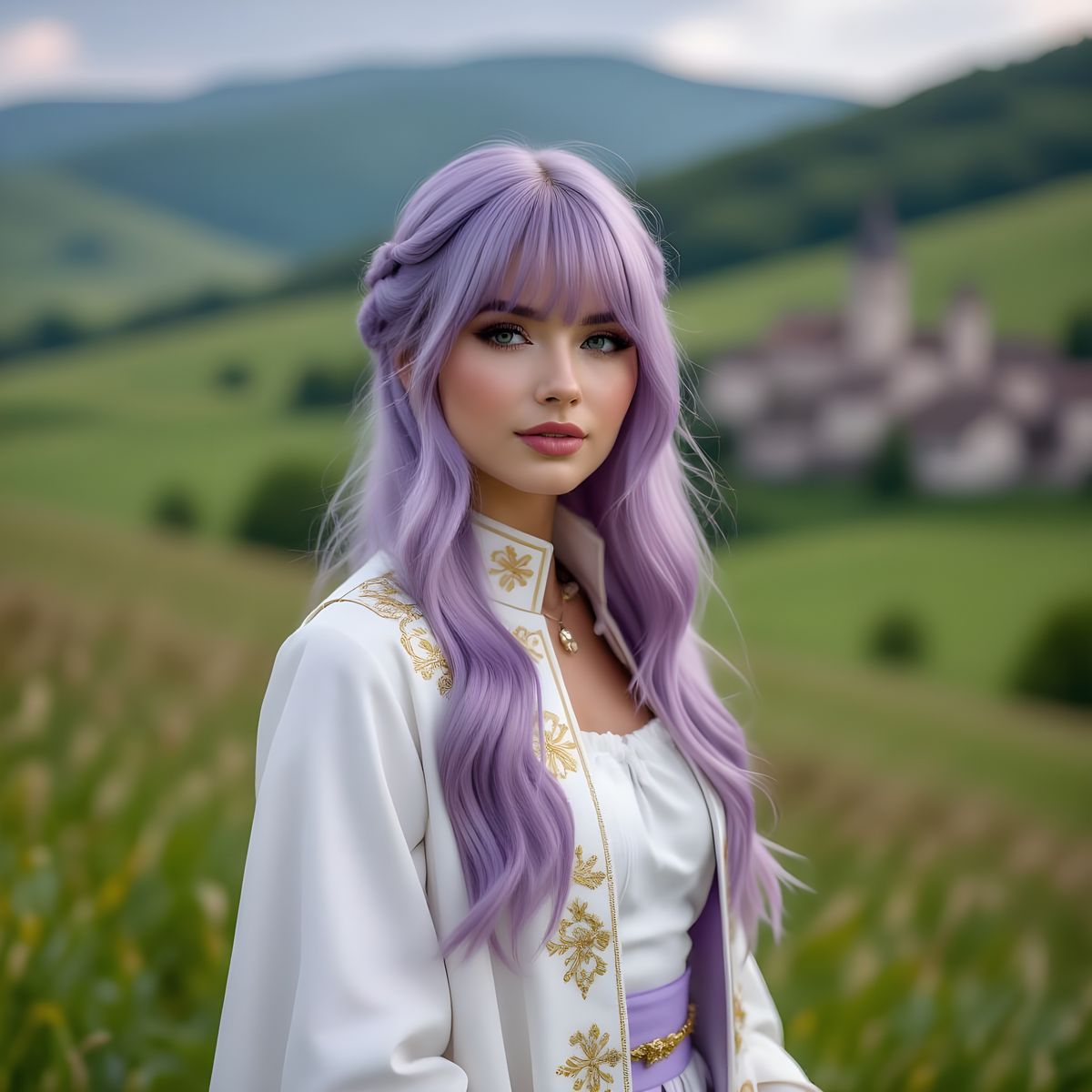 This image shows a lifelike photograph of a young woman with lavender hair and violet eyes, reminiscent of Fern from "Sousou no Frieren". She is wearing mage-style attire and captured in soft daylight.
