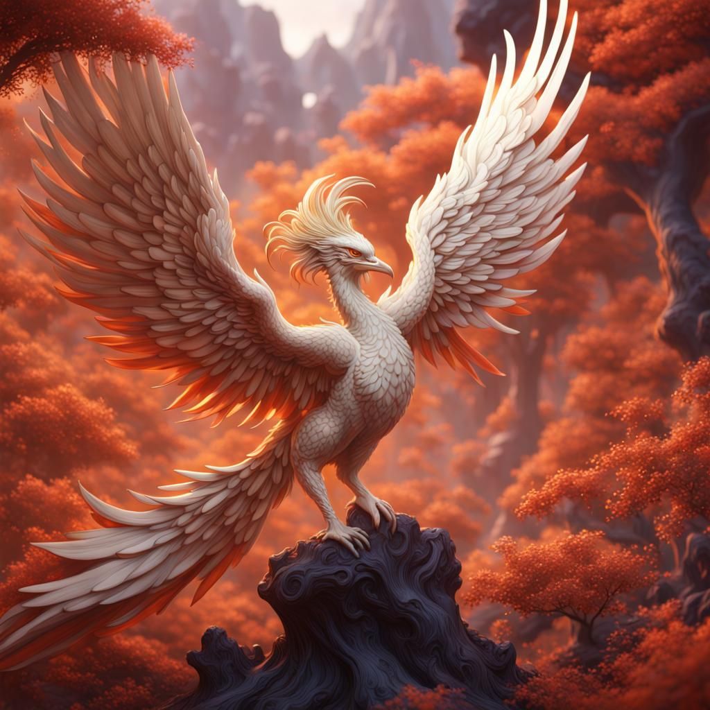 A detailed matte painting of a phoenix ivory netsuke. The image features deep colors, intricate details, and complementary colors, resembling fantasy concept art in 8k resolution.