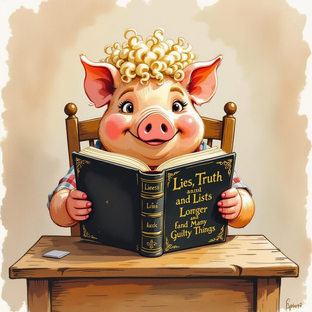 A whimsical illustration of a plump orange pig with blond hair seated at a desk, holding a black book. The image features watercolor textures and warm, earthy tones.