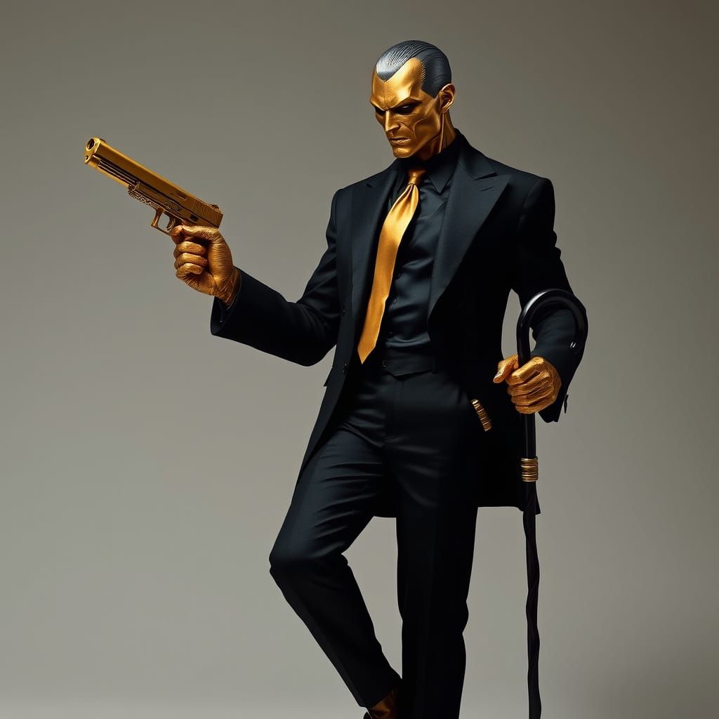 A striking picture of a gold-skinned supervillain in a black suit, holding a gold handgun and cane. The image has a dark, futuristic, metallic aesthetic.