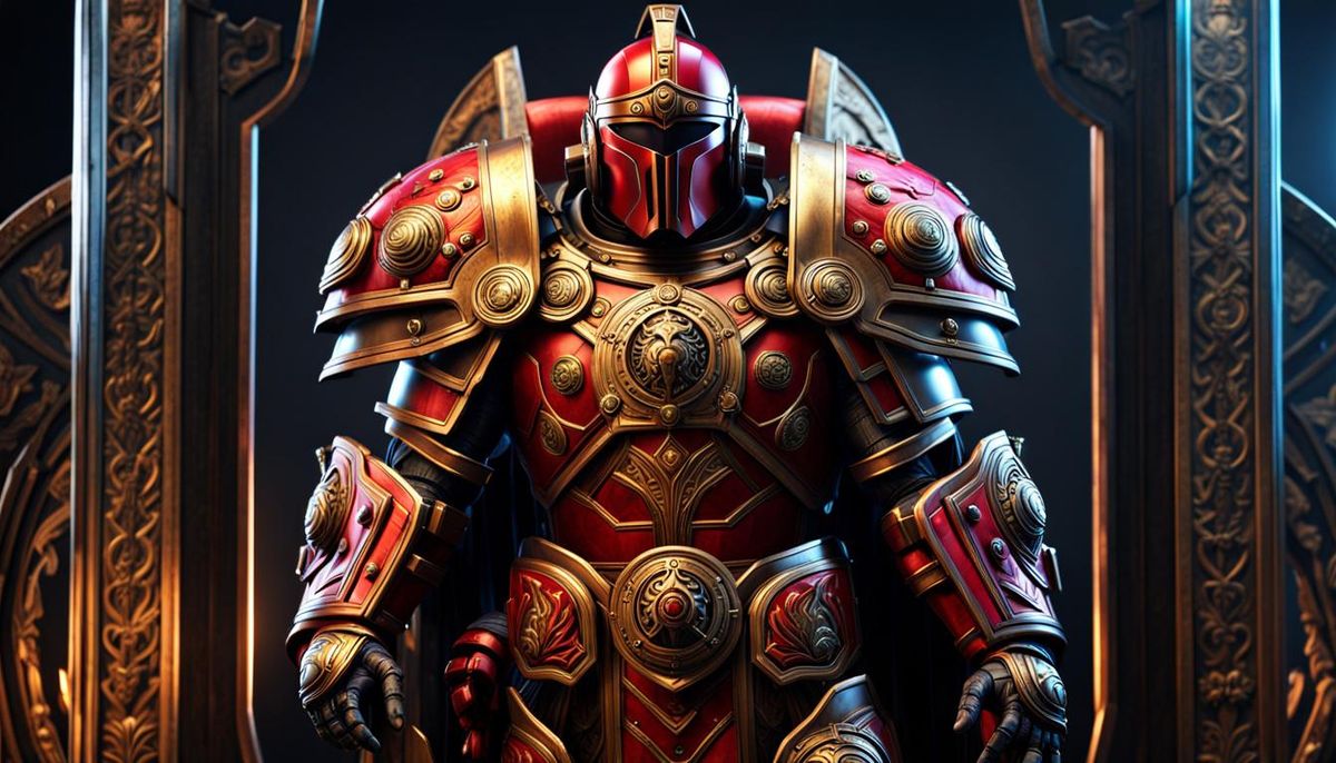 This image depicts a futuristic Roman Centurion-inspired space marine. The figure features vibrant colors and intricate details, set in dramatic lighting with a dynamic pose, rendered as 3D art.
