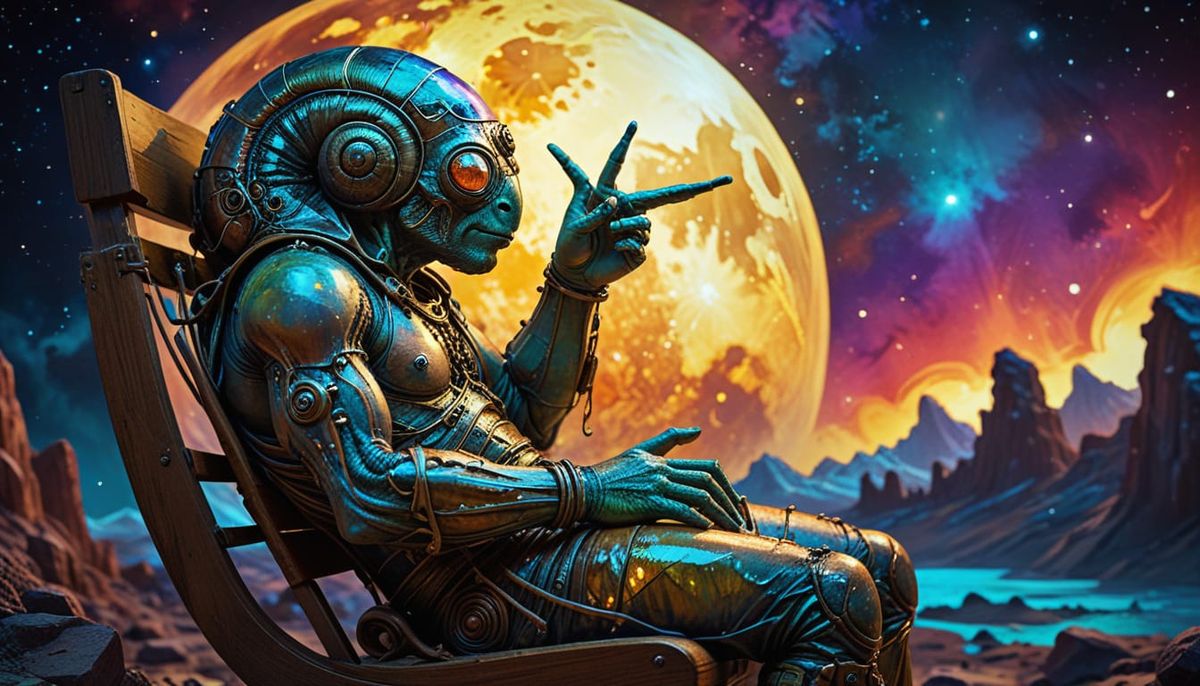 This image shows an indignant snail alien sitting on a rocking chair on the moon. The portrait features vibrant, glowing eyes and intricate shell patterns in a fantasy art style. The scene is bathed in warm, golden lighting.