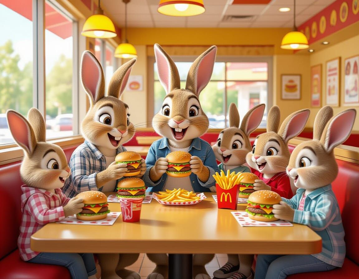 This image shows a rabbit family enjoying a meal at McDonald's. The scene, in a whimsical cartoon style, features vibrant colors, playful decorations, and exaggerated expressions.