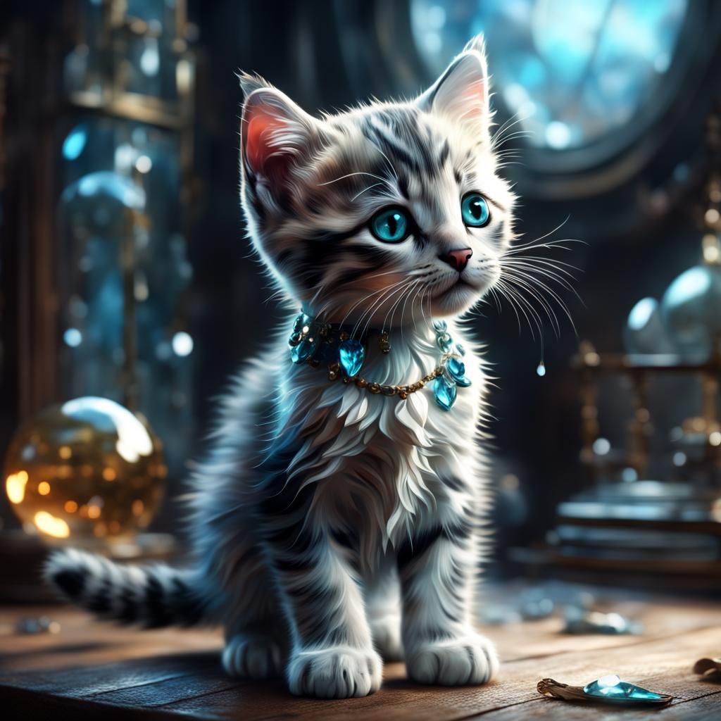 A digital matte painting of a beautiful glass kitten. The image is intricately detailed and cinematic, with a dramatic, maximalist, and atmospheric feel.