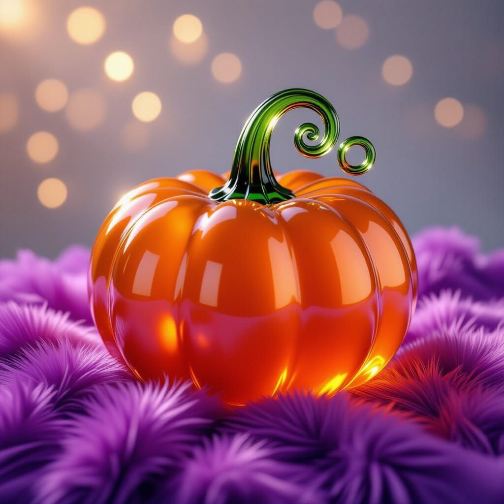 This image showcases a hyperrealistic 3D render of a transparent glass pumpkin with a curly green stalk, resting on sparkly purple fur. Cinematic lighting highlights its detailed texture.