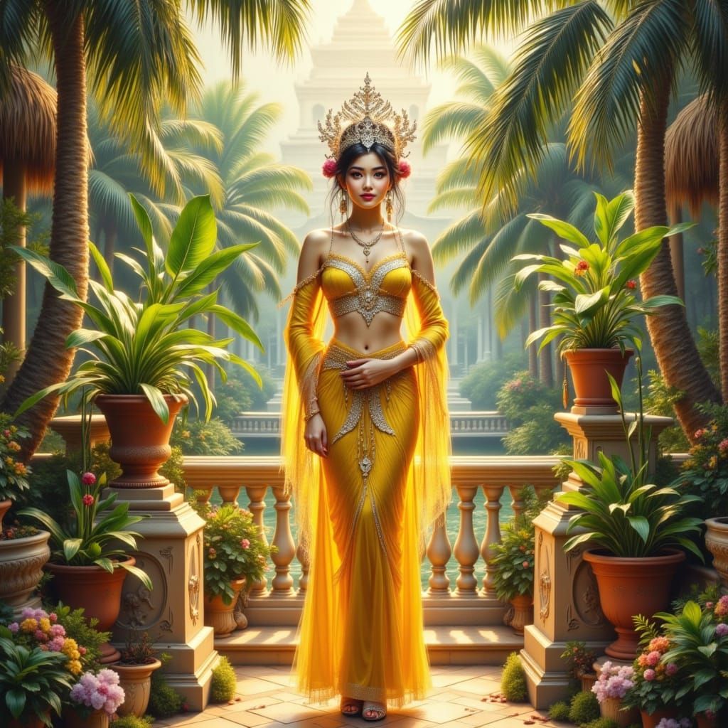 A serene Thai beauty, dressed in a intricately embroidered and beaded vibrant yellow Chut Thai Chakkri outfit, complete with delicate silver accents and ornate headdress, she stands majestically in front of the revered Temple of the Emerald Buddha, surrounded by a lush and vibrant garden filled with exotic flowers and towering palm trees, bathed in soft, warm, natural light that filters through the leaves, evoking a sense of tranquility and cultural heritage.