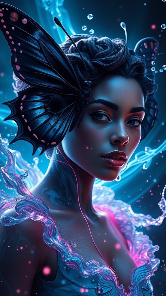 This image shows a dramatic head and shoulders portrait of a black butterfly emerging from a stormy sea. The artwork features dynamic lighting, intricate details, and a triadic color scheme.