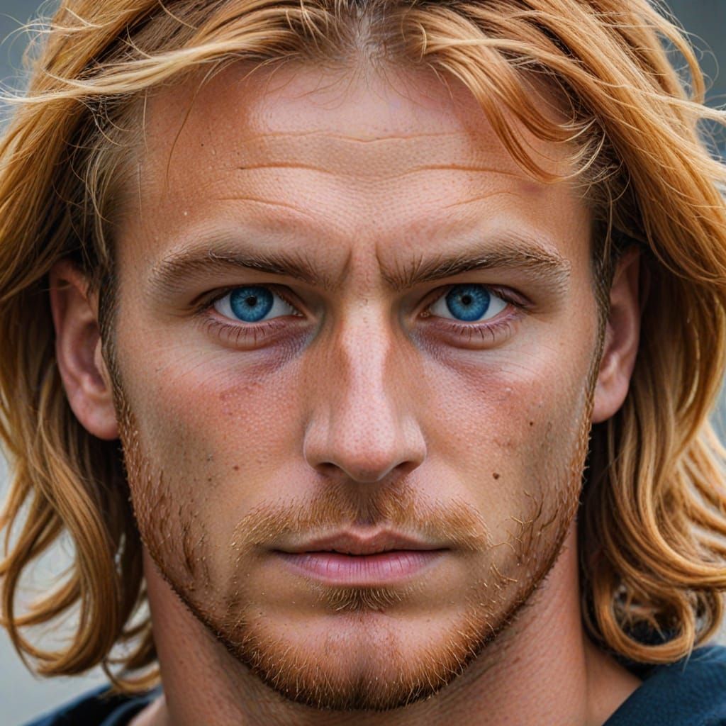 This image shows a close-up portrait of a man with fiery blond hair and piercing dark blue eyes. The focus is on his striking features and intense gaze.