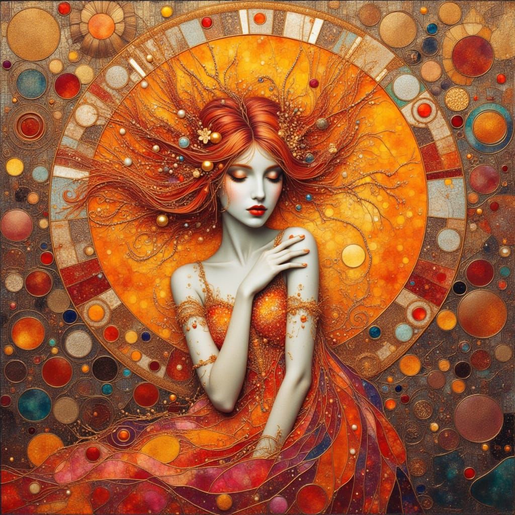A digital portrait of a fairy-like fire goddess with intricate circular motifs and gold leaf details. The artwork has a vibrant color palette and a whimsical, mystical aesthetic reminiscent of art deco.