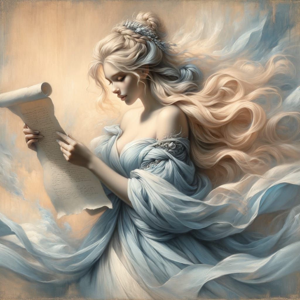 This image depicts a serene Nordic goddess with braided blonde hair, wearing a powder blue gown, reading a parchment. Rendered in a romantic style with rich textures and dramatic light, using soft pastels.
