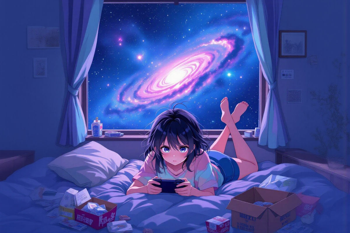 This image shows an anime girl engrossed in video games in her messy room. She is illuminated by the breathtaking galaxy visible through her window, all rendered in a vibrant anime style.