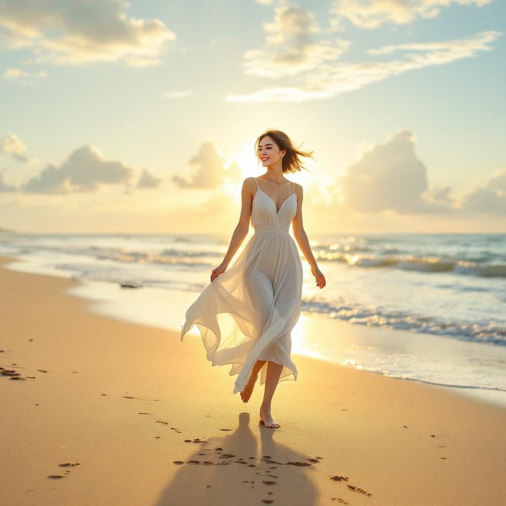 This image shows a serene Thai woman in a flowing white dress walking barefoot on a sunlit beach as the golden sunrise reflects on the calm sea. She exudes charm and grace.