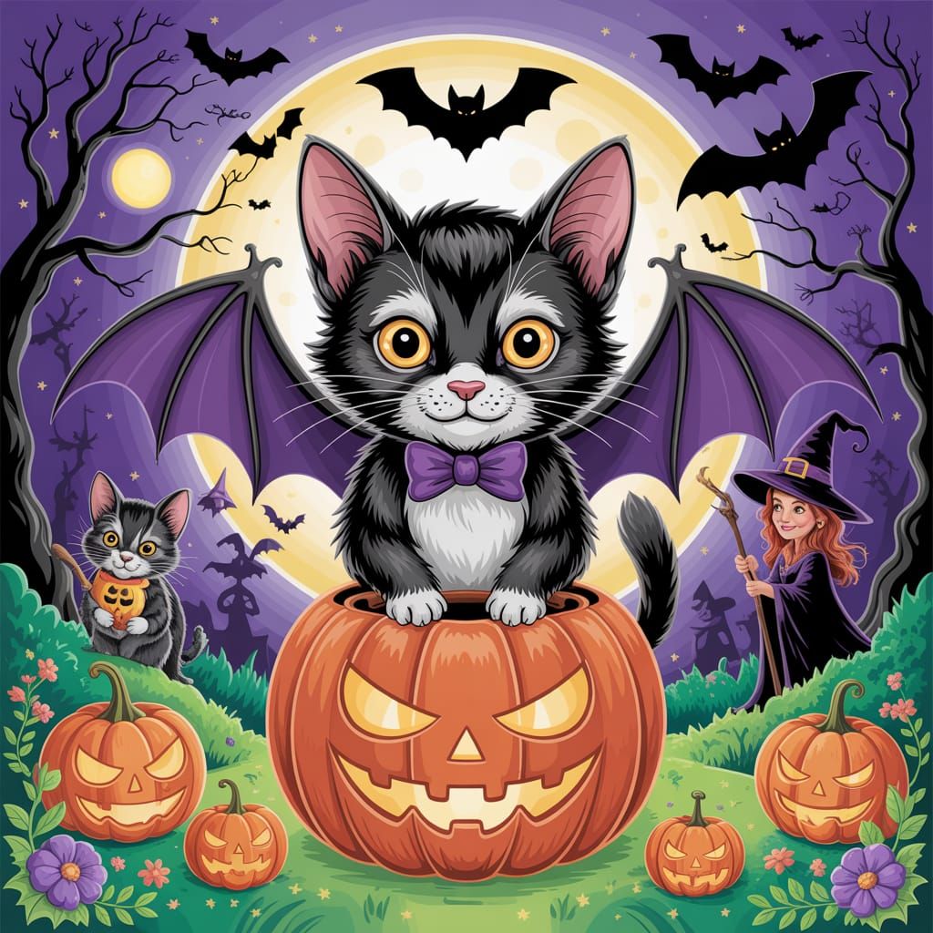 Intricately detailed, Storybook illustration, Magical, Mystical Halloween, bat-kitties, purple, Witches, fantasy illustration, detailed painting, and deep color
