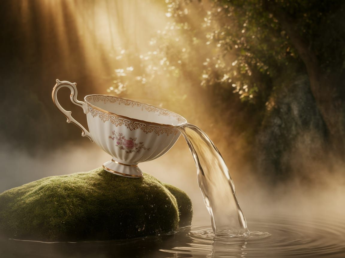 A captivating image of a delicate teacup filled by a gentle waterfall. The scene is bathed in warm, golden light, highlighting the intricate details of the teacup and the surrounding lush forest.