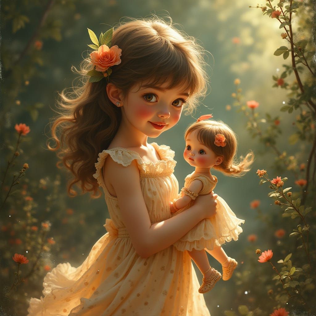 This image shows a playful girl in a sundress with an antique doll, bathed in gentle, warm illumination. The art captures a whimsical, illustrative style.