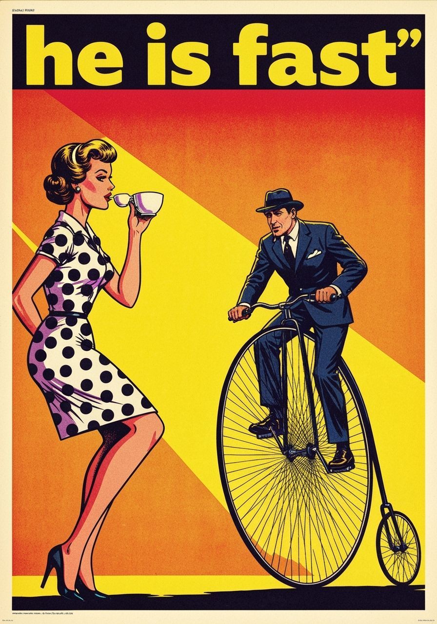 This vintage-style travel poster features a Pop Art illustration of a woman enjoying coffee as a man rides a penny-farthing. Vibrant, saturated colors and a grainy texture evoke 1970s print aesthetics.
