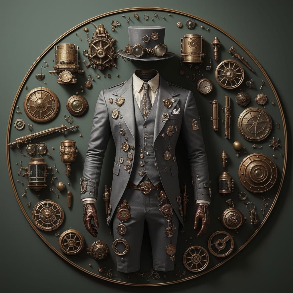 This image showcases a highly detailed steampunk outfit with multiple parts, arranged in a knolling layout, featuring intricate textures and depth, reminiscent of a bygone era.