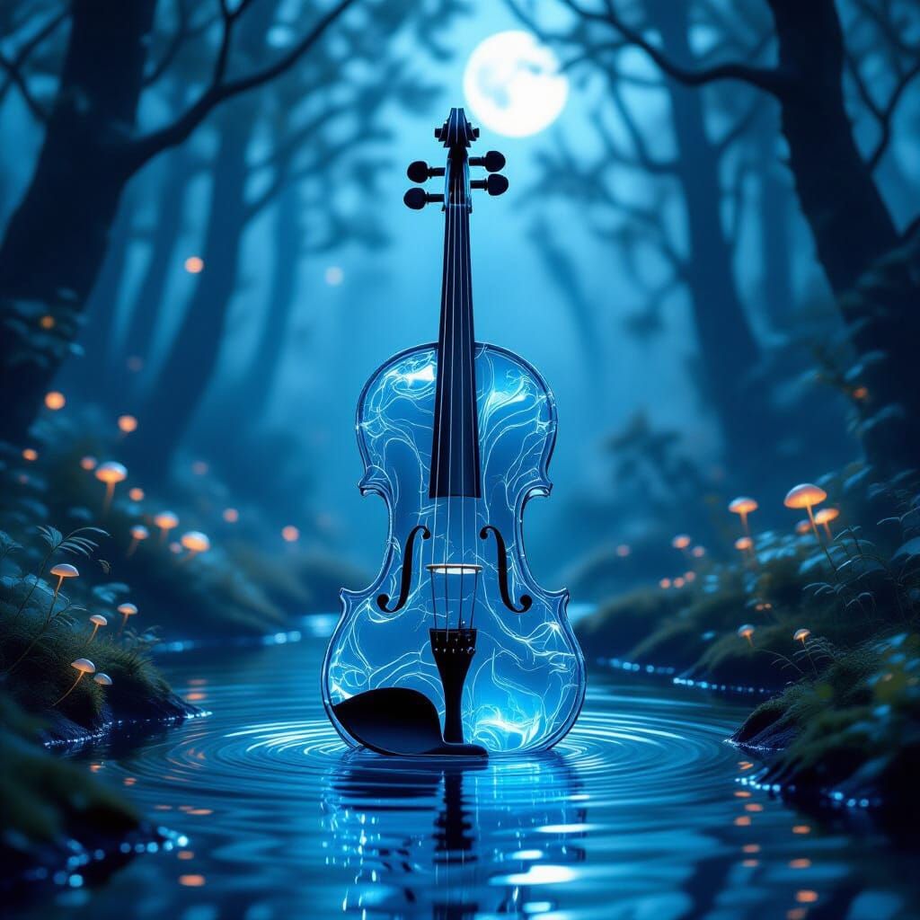 This surreal image depicts a violin crafted from flowing water, glowing with otherworldly light in a misty forest. Dynamic lighting creates dramatic contrasts.