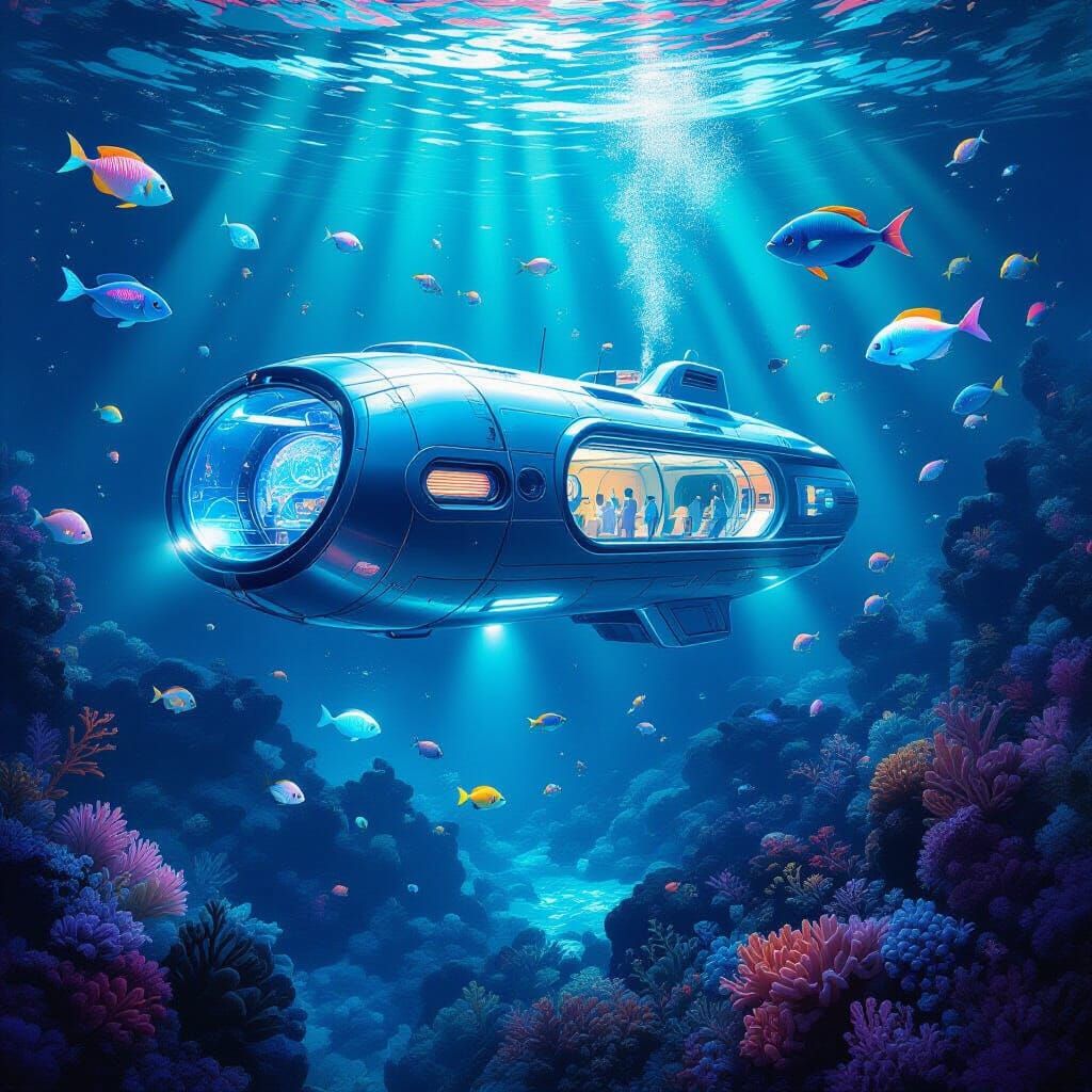 This image depicts a sleek research station in a colorful coral reef filled with unique, glowing sea creatures. Rendered in a digital painting style with Art Nouveau and fantasy influences, featuring atmospheric lighting and bioluminescence.