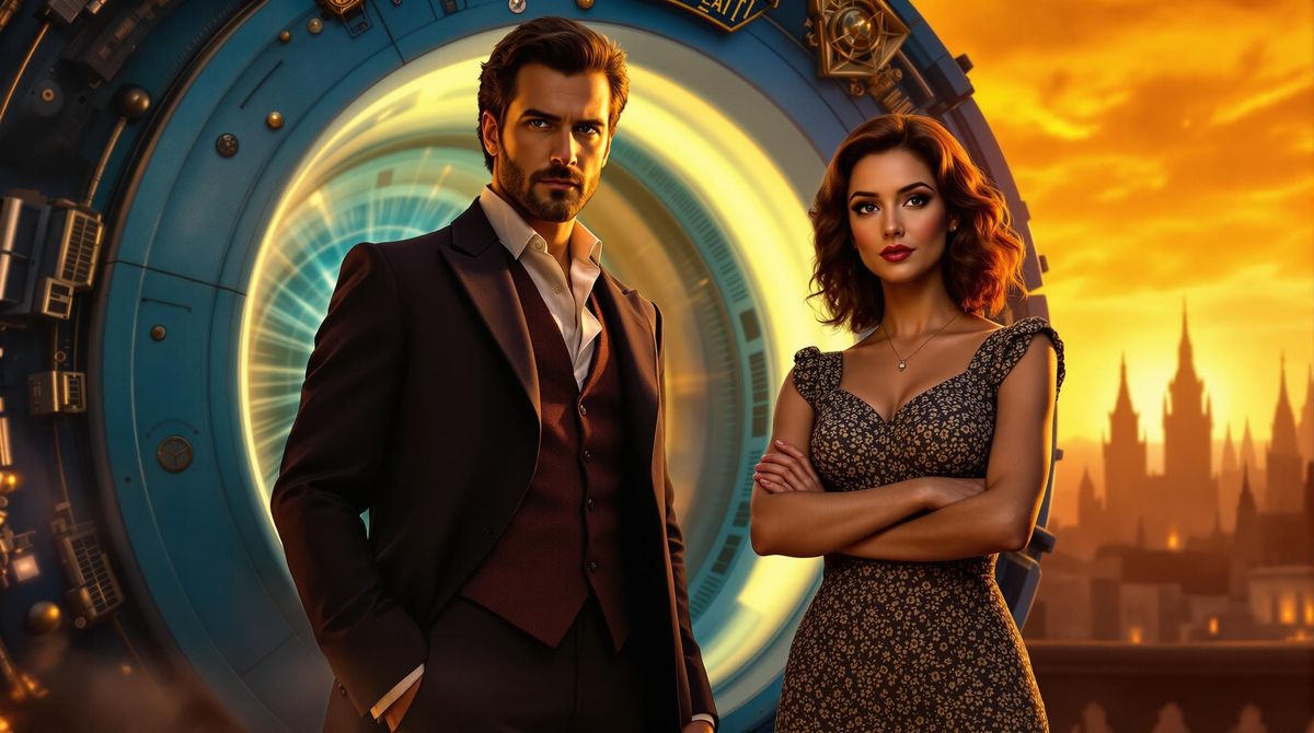 A striking picture of two figures posed before a time-travel machine. The scene is set in a sci-fi cityscape with dramatic lighting and historic European architectural influences, as seen in a fantasy film poster.