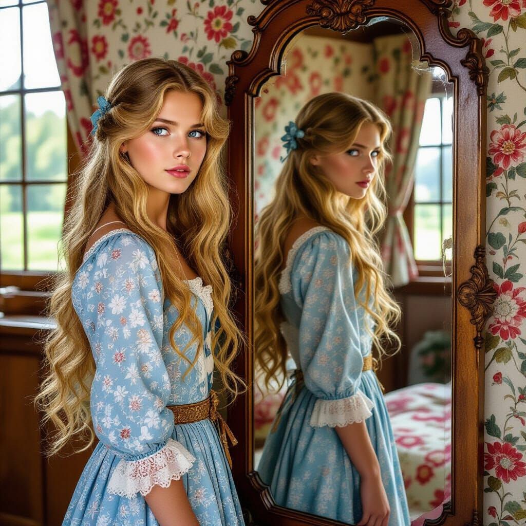 A captivating image of a medieval maiden with flowing blonde hair and blue eyes, standing before an antique mirror in her chamber. The scene evokes a fairytale atmosphere in the style of Alphonse Mucha.