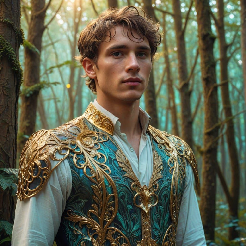 A young man stands in a mystical forest, captured in this fantasy image. The artwork features art nouveau elements, intricate gold details, and soft, ethereal lighting, as if painted by Alphonse Mucha.